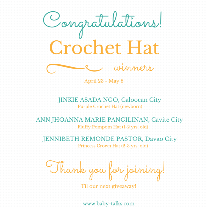 Crochet Hat Winners_050915 Published: May 9, 2015Full size: 800 × 800Attached: Up For Grabs: 3 Cute Crochet Hats « » You might also like:Up For Grabs: 3 Cute Crochet HatsMomma Karma #1Kids Can Read Earlier Than We ThinkAn Afternoon of Fun At Kidzooona Manila9 Extras That Are Worth The Space In Your Diaper Bag